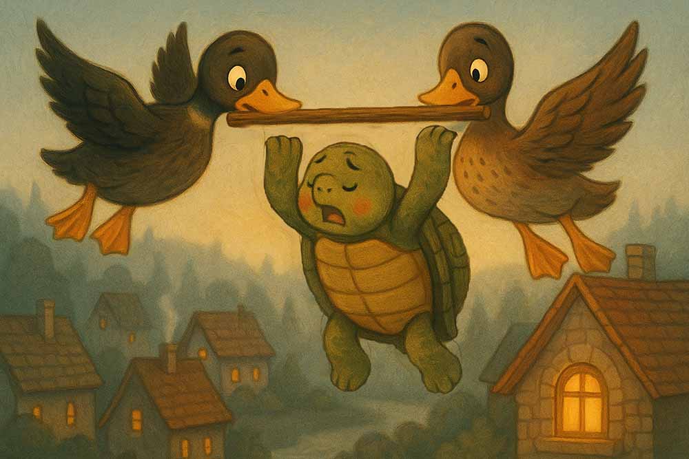 یکی از اردکها گفت: «راستی، ما میتونیم کمکت کنیم! اینجا یه تیکه چوب هست، تو با دندون بگیرش. ما هم دو طرفش رو میگیریم و با هم پرواز میکنیم. کل شهر رو از بالا میبینی! فقط… یه شرط داره: به هیچ وجه نباید حرف بزنی! وگرنه کارت تمومه…»