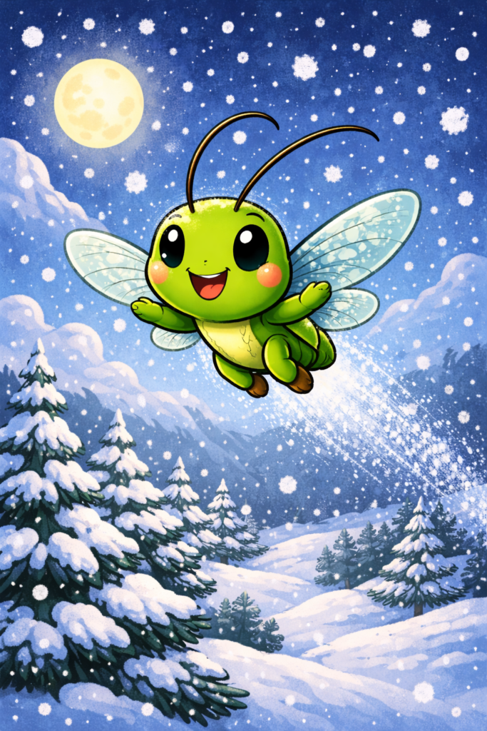 وقتی بالاخره رسید، بالهایش تقریباً از حالت یخزدگی خارج شده بودند.این بار وقتی آنها را به هم مالید، صدای جیرجیر تولید شد که هیچکس در جنگل تا آن زمان نشنیده بود. و هر بار که بالهایش را به هم میمالید، صدای جیرجیر کمی بلندتر میشد و یخزدگی آنها کمتر میشد.